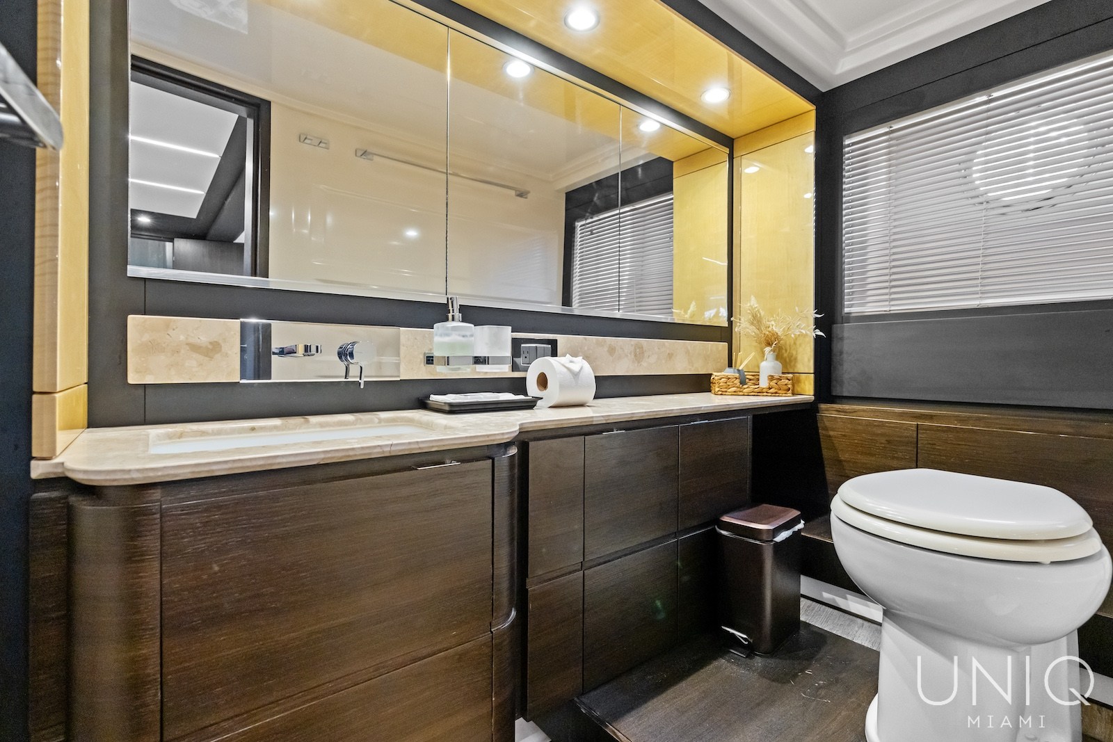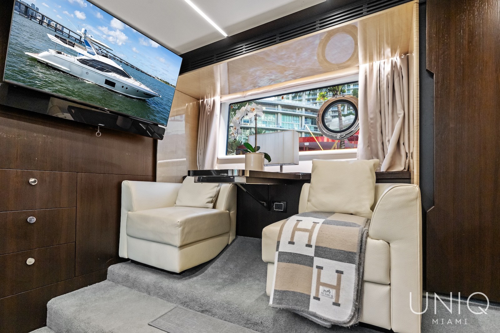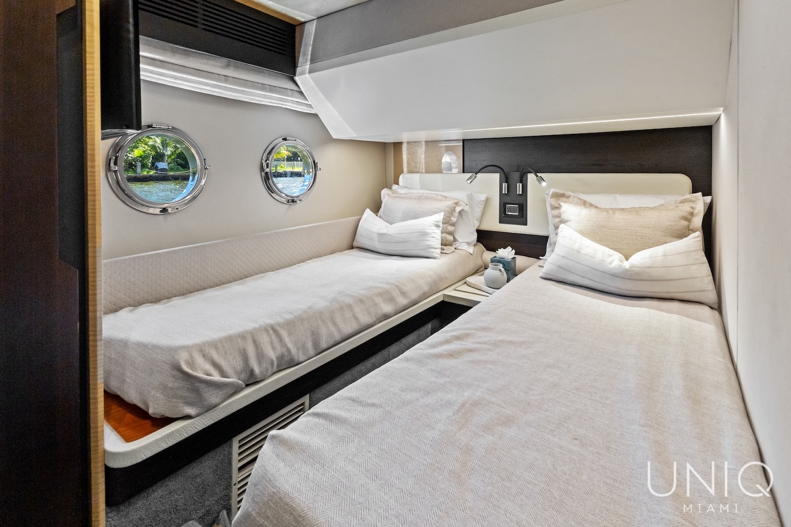 Inside, the yacht features four beautifully appointed cabins, including a full-beam master suite, a VIP cabin, and two twin guest cabins, accommodating up to 8 guests overnight. Each cabin is elegantly designed with high-end materials, private en-suite bathrooms, and modern amenities. A dedicated crew of up to four ensures every detail of your journey is flawless, from gourmet dining to attentive service. Whether hosting a celebration, a romantic escape, or a family adventure, the 68’ Azimut Yacht by UNIQ Miami Yacht Charters offers the perfect blend of comfort, style, and personalized luxury on the water.